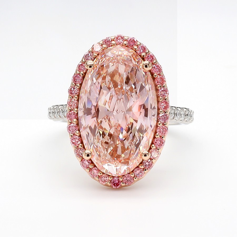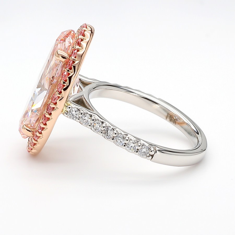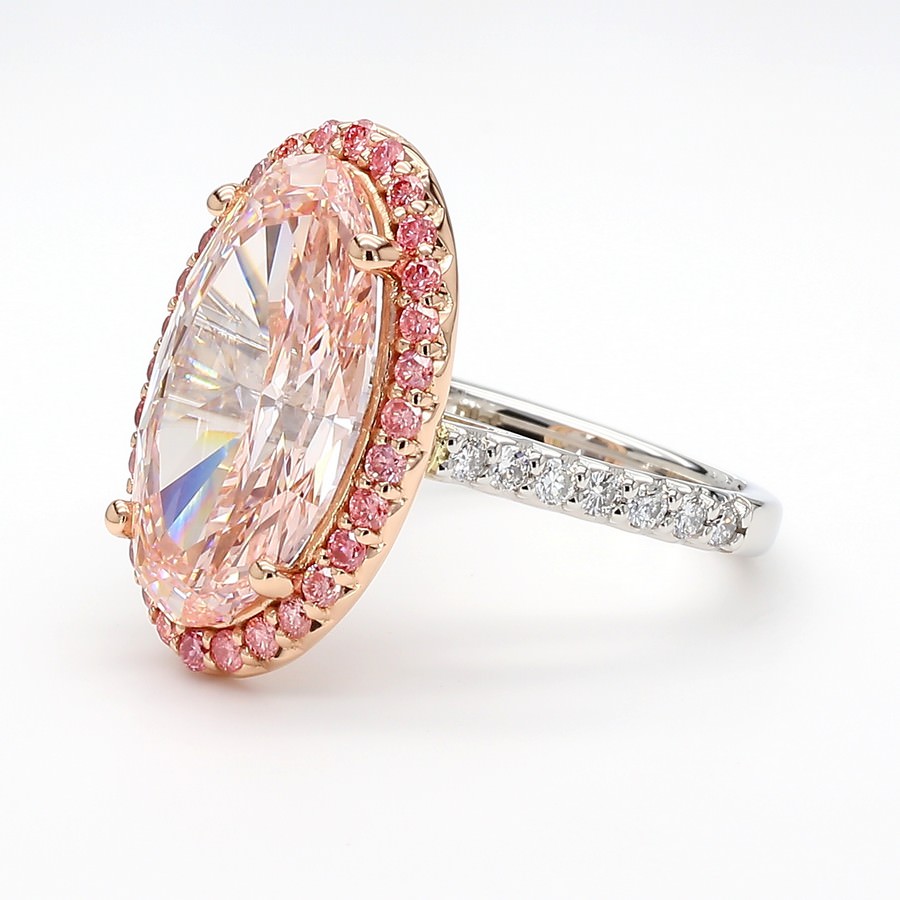Add a bold, romantic touch with this exceptional ring, featuring a 5-carat lab-grown oval diamond in sparkling Pink color and VS clarity at its heart. The design’s two-tone halo frames the center with vibrant pink stones, beautifully contrasted against brilliant white pave-set diamonds along the band for a stylish play of color and light. Set in luminous 14K white gold, this ring perfectly blends contemporary flair, ethical luxury, and eye-catching elegance for a striking statement piece.