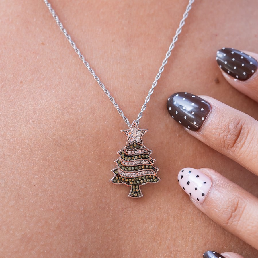 14K White Gold Green and White Christmas Tree Pendant Necklace