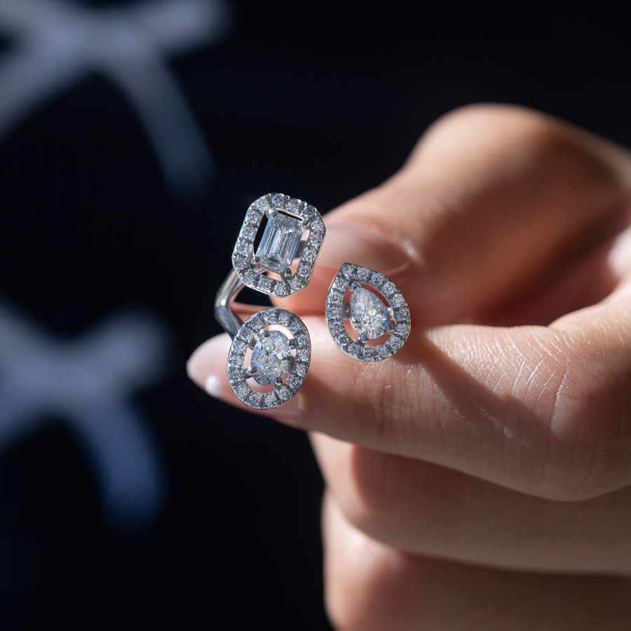 Celebrate breathtaking brilliance with this exquisite 2 Carat Total Weight 3-Stone Halo Ring, thoughtfully crafted in luminous 14K white gold. Featuring a captivating trio of lab-created diamonds—Oval, Emerald, and Pear—this design unites three iconic shapes into one harmonious, eye-catching masterpiece. Each center stone is surrounded by a halo that enhances its fire and presence, while F–G color and VS clarity ensure exceptional sparkle from every angle. Symbolizing past, present, and future, this ring offers a modern yet deeply meaningful aesthetic. Perfect for marking life’s milestones or elevating everyday elegance, it’s a stunning statement piece that effortlessly stands out.