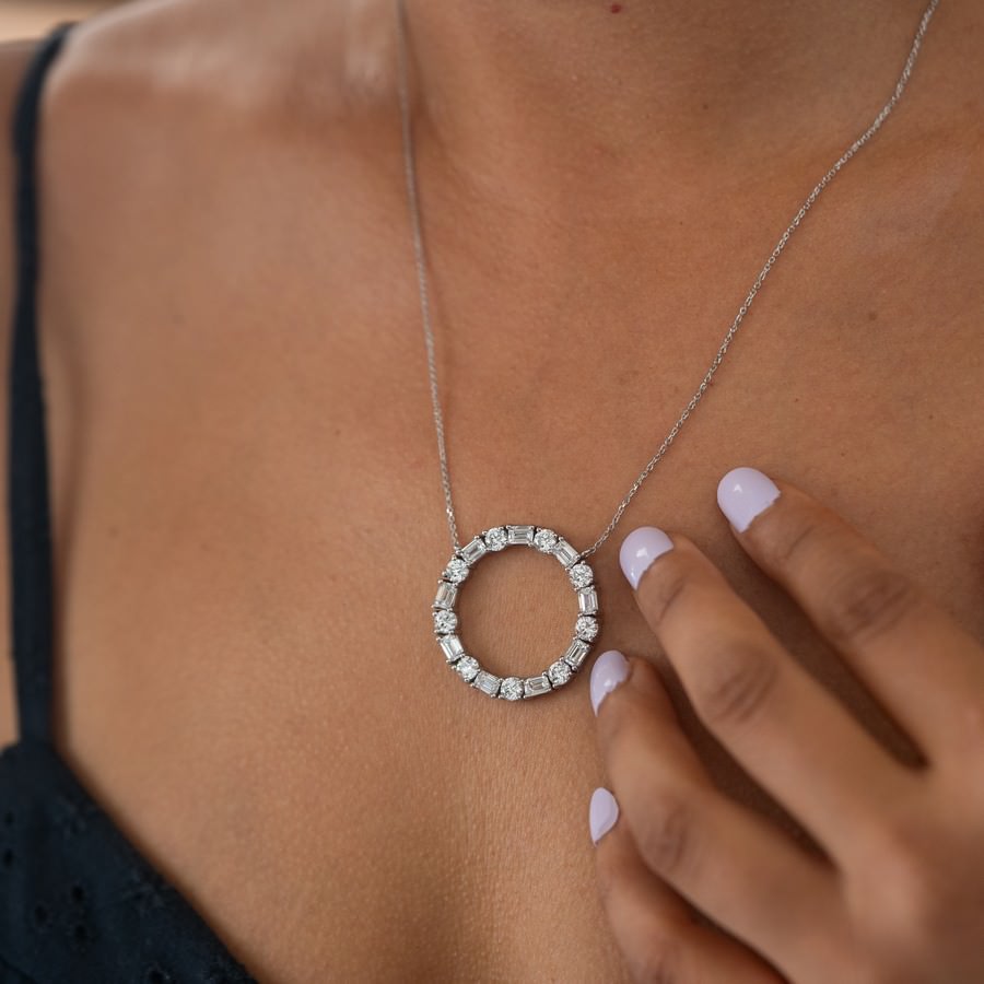 Celebrate connection and contrast with the Round-Emerald Brilliant Unity Circle Necklace. This elegant pendant features a harmonious blend of round and emerald-cut lab diamonds, symbolizing unity through diversity. The clean lines of the emerald cuts perfectly complement the sparkle of round brilliants, all set in a timeless 14K gold circle. Designed for everyday sophistication or special occasions, this necklace is a graceful expression of balance, beauty, and brilliance.
