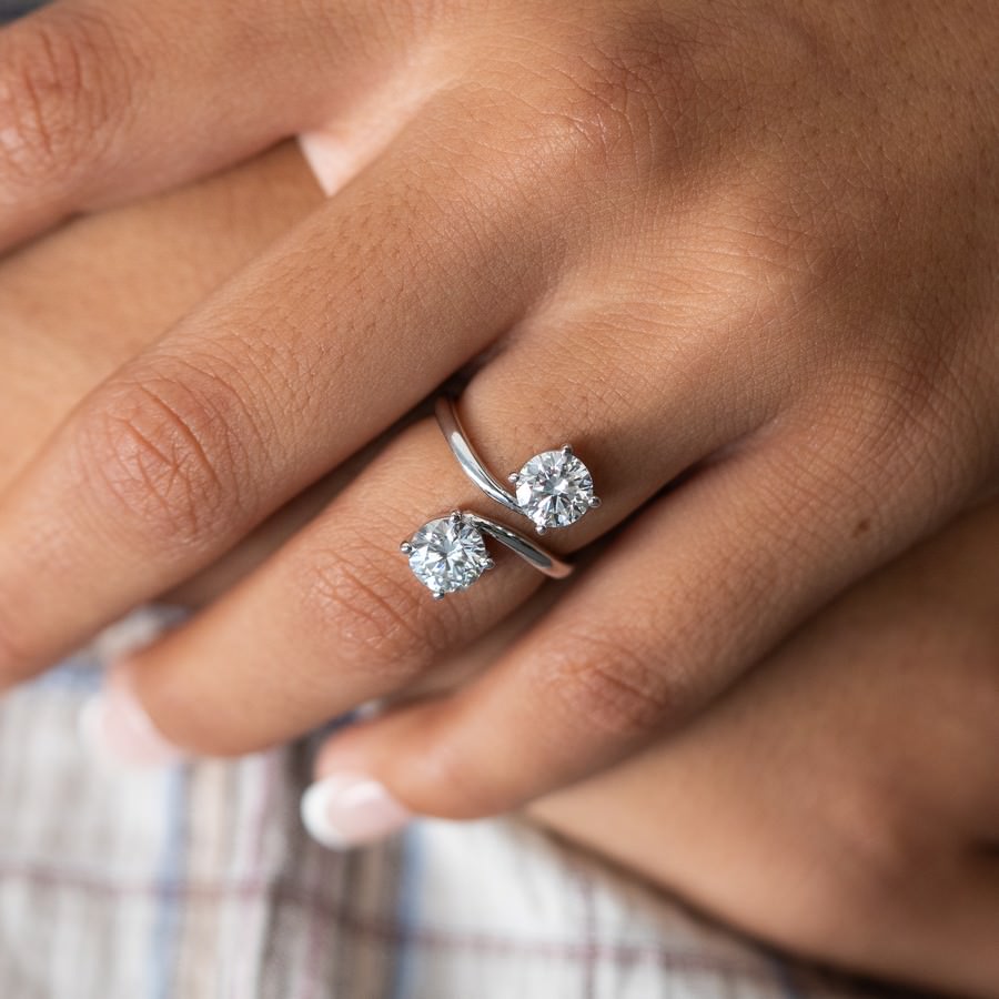 Celebrate connection through contrast with the Duality Ring. Crafted in 14K white gold, this modern yet timeless piece features two round lab-created diamonds totaling 2 carats (CTW), with F-G color and SI clarity for exceptional brilliance. The open-band design elegantly separates the stones—symbolizing two individuals walking their own paths, yet always linked. Whether you're honoring a long-distance relationship, a deep friendship, or a bond that transcends place and time, the Duality Ring is a powerful expression of love that bridges any divide.