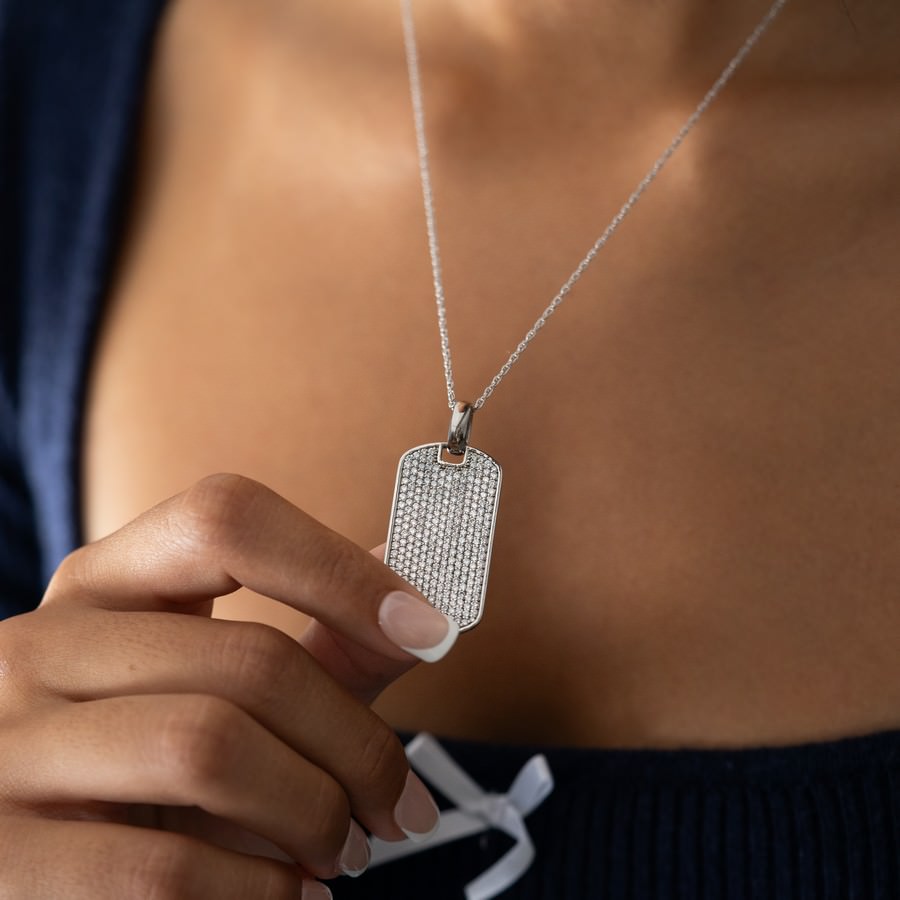 14K White Gold Full Pave Dog Tag Necklace