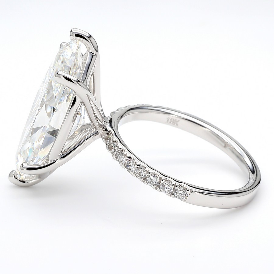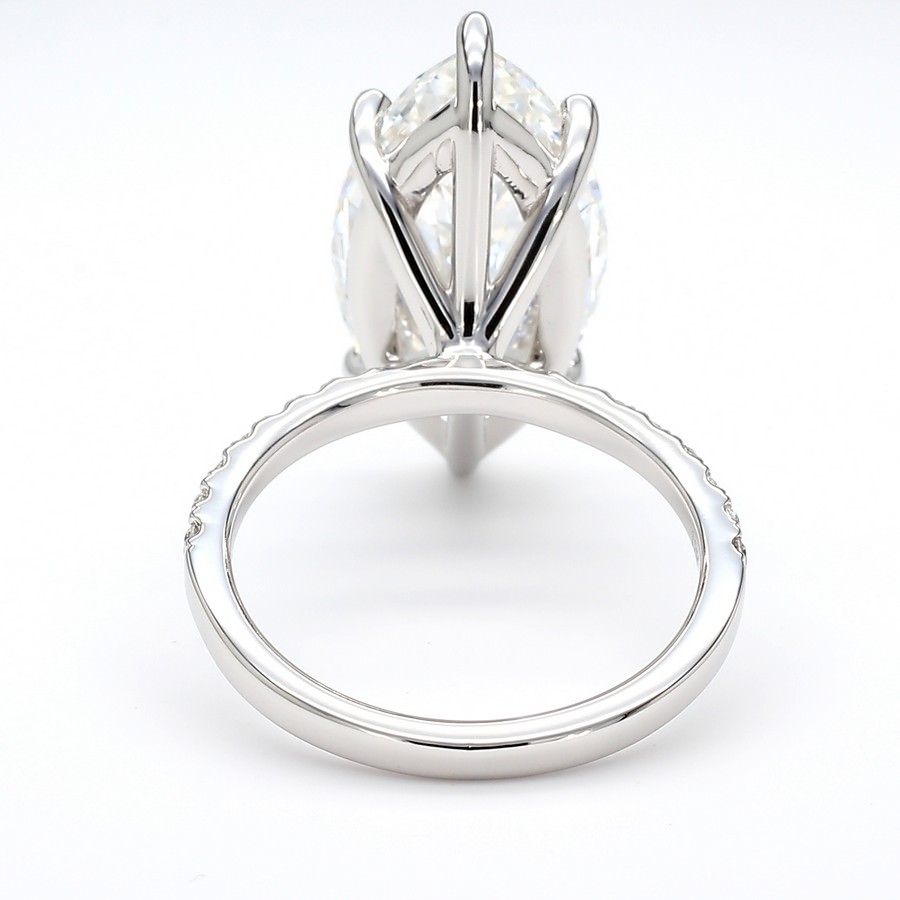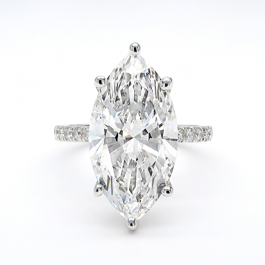 Experience regal brilliance with this exquisite 5-carat IGI certified marquise-cut lab-grown diamond, artfully set in a white gold band encrusted with pave-set diamonds. The striking marquise center stone, celebrated for its elongated silhouette and captivating sparkle, is enhanced by the additional shimmer from the delicate pave setting. Crafted for those who seek a blend of vintage charm and modern sophistication, this ring is a stunning tribute to both ethical beauty and distinguished style.