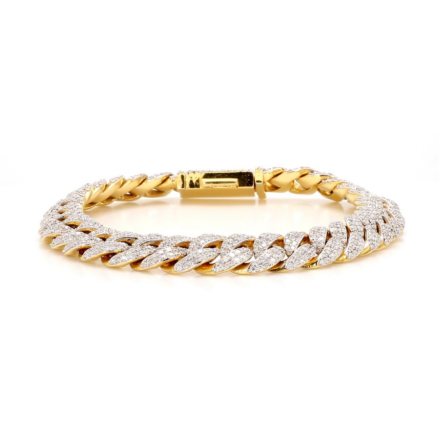Make a bold, definitive statement with this classic icon of luxury, featuring a 9.25-carat total weight of shimmering natural diamonds. Expertly crafted in radiant 14K yellow gold, each signature curb link is meticulously hand-set with a dense pave of brilliant-cut diamonds. The high-polish gold provides a rich, warm backdrop that amplifies the icy fire of the stones, creating a continuous "iced-out" silhouette. Finished with a secure, diamond-encrusted integrated box clasp, this bracelet is a masterpiece of urban sophistication—perfect for the high-end collector seeking a timeless blend of weight, light, and prestige.